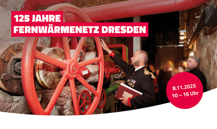 Auf dieser Seite können Sie sich für eine Führung durch unseren Historischen Fernwärmekanal anlässlich des 125. Geburtstages der Fernwärme registrieren. Tauchen Sie ein in die Geschichte einer Meisterleistung, die sich heute zu einem rund 660 km langen zentralen Wärmenetz entwickelt hat und damit einer der wichtigsten Bausteine für die Wärmeversorgung in Dresden ist.